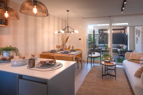 Perfecta distribución que se adapta a tu necesidades, desde los detalles hasta la eficiencia de sus espacios, para que disfrutes de la máxima comodidad. Es por esto que diseñamos una cocina abierta con completo equipamiento, campana, horno, encimera, cubierta de porcelanato, muebles con cierre suave y comedor de diario.